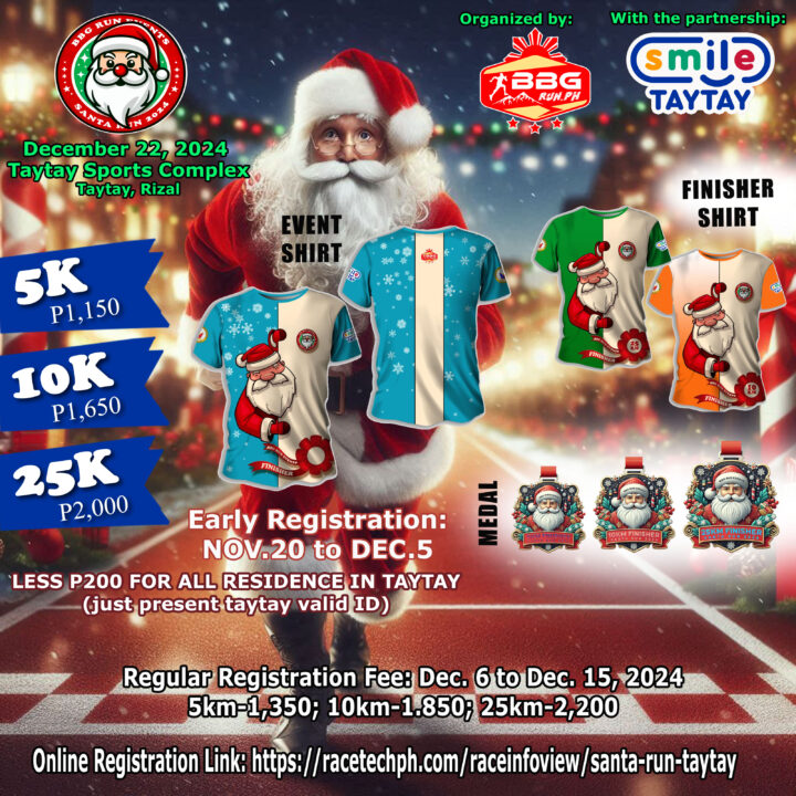 The Santa Run Taytay 2024 is set to bring holiday cheer to the Taytay Sports Complex in Taytay, Rizal, on December 22, 2024. Organized by BBG Run PH in partnership with Smile Taytay, this festive running event offers distances of 5K, 10K, and 25K, making it perfect for runners of all levels.
