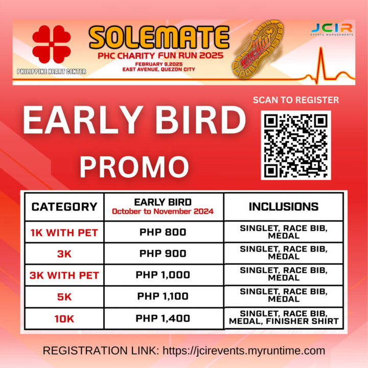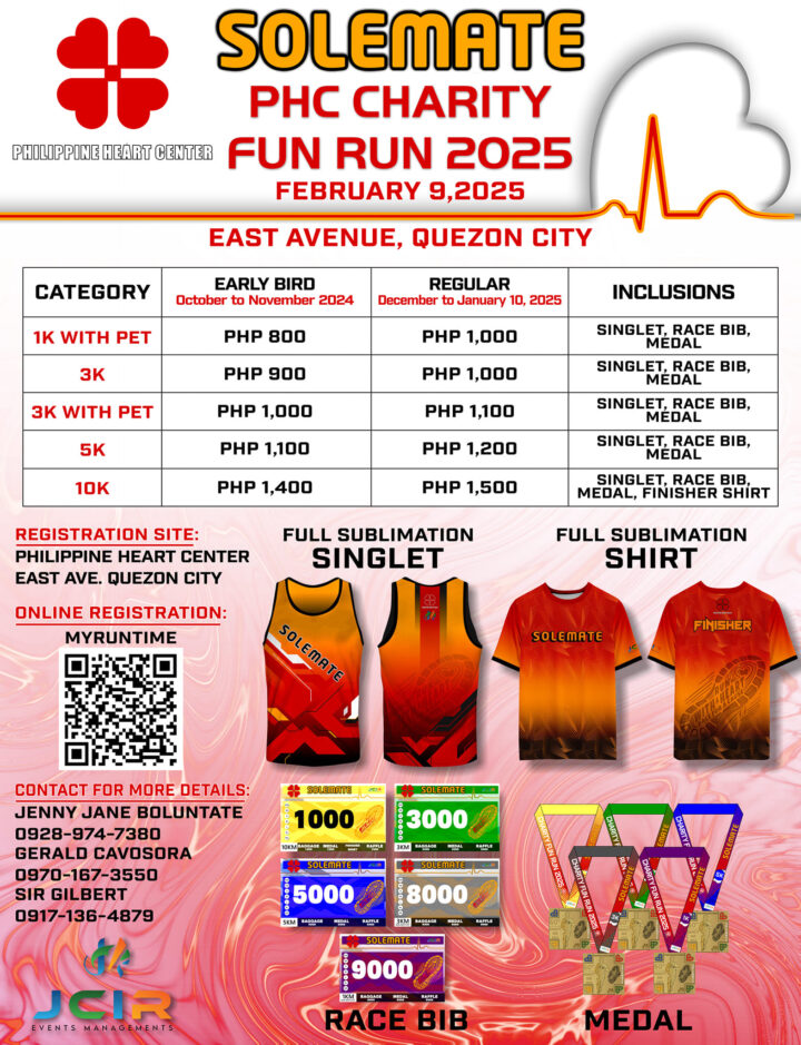 The Solemate: Philippine Heart Center Charity Fun Run 2025 is a heartfelt event happening on February 9, 2025, at Matalino St., Diliman, Quezon City. Organized by JCIR Events Management, this run aims to raise funds and awareness for heart health initiatives benefiting patients with valvular heart disease at the Philippine Heart Center.