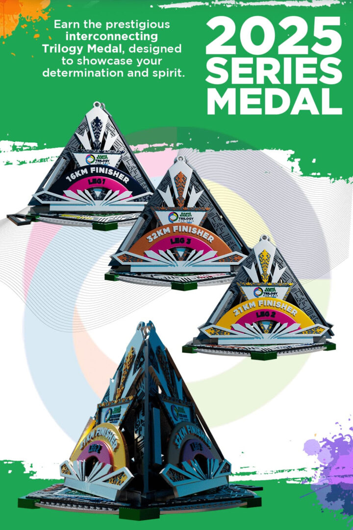 Take your running journey to the next level by earning the coveted interconnecting trilogy medal. Complete all three legs in your city to unlock this prestigious award—a true testament to your determination and spirit as a runner.
