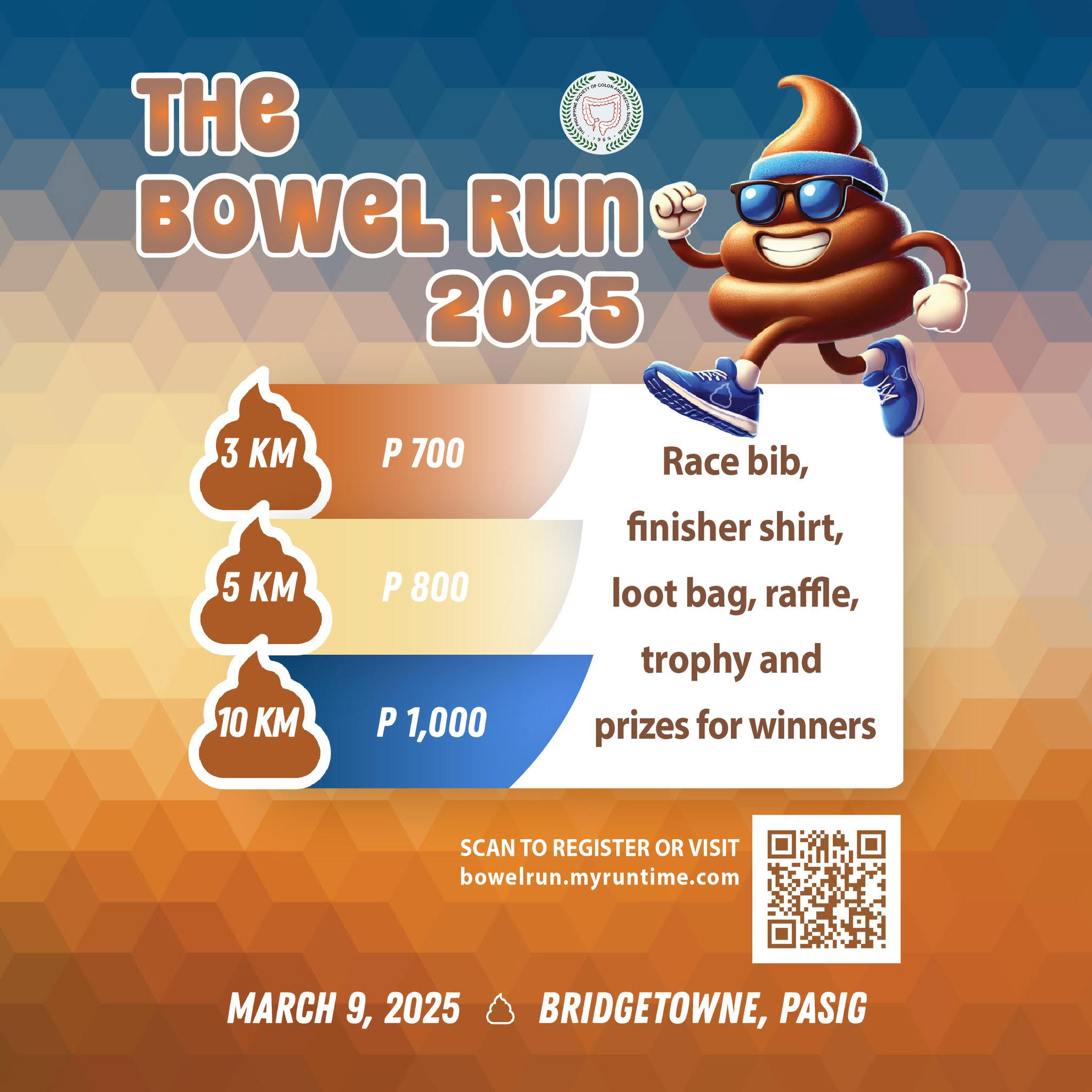 The Bowel Run 2025 is a fun and meaningful running event organized by the Philippine Society of Colon and Rectal Surgeons (PSCRS) in observance of Colorectal Cancer Awareness Month this March. Taking place on March 9, 2025, at Bridgetowne, Pasig City, this event aims to raise awareness about colorectal cancer—one of the most common and deadly cancers in the Philippines and worldwide.