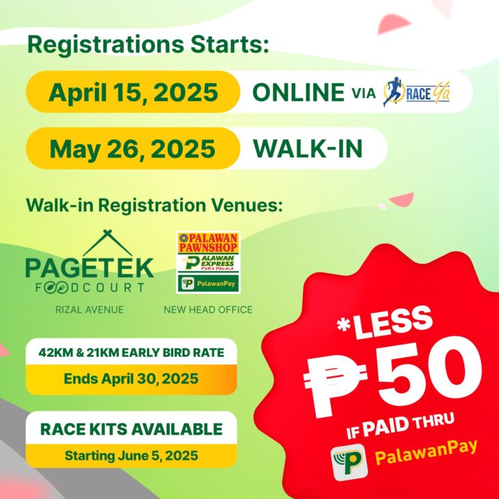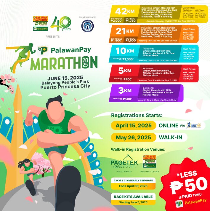 With exclusive discounts for PalawanPay users and generous cash prizes for top finishers, runners of all levels have every reason to lace up and join the fun. All participants will receive a comprehensive runner’s kit and finishers in longer distances will enjoy a loot bag packed with goodies. Register now and make every stride count in this unforgettable island run.