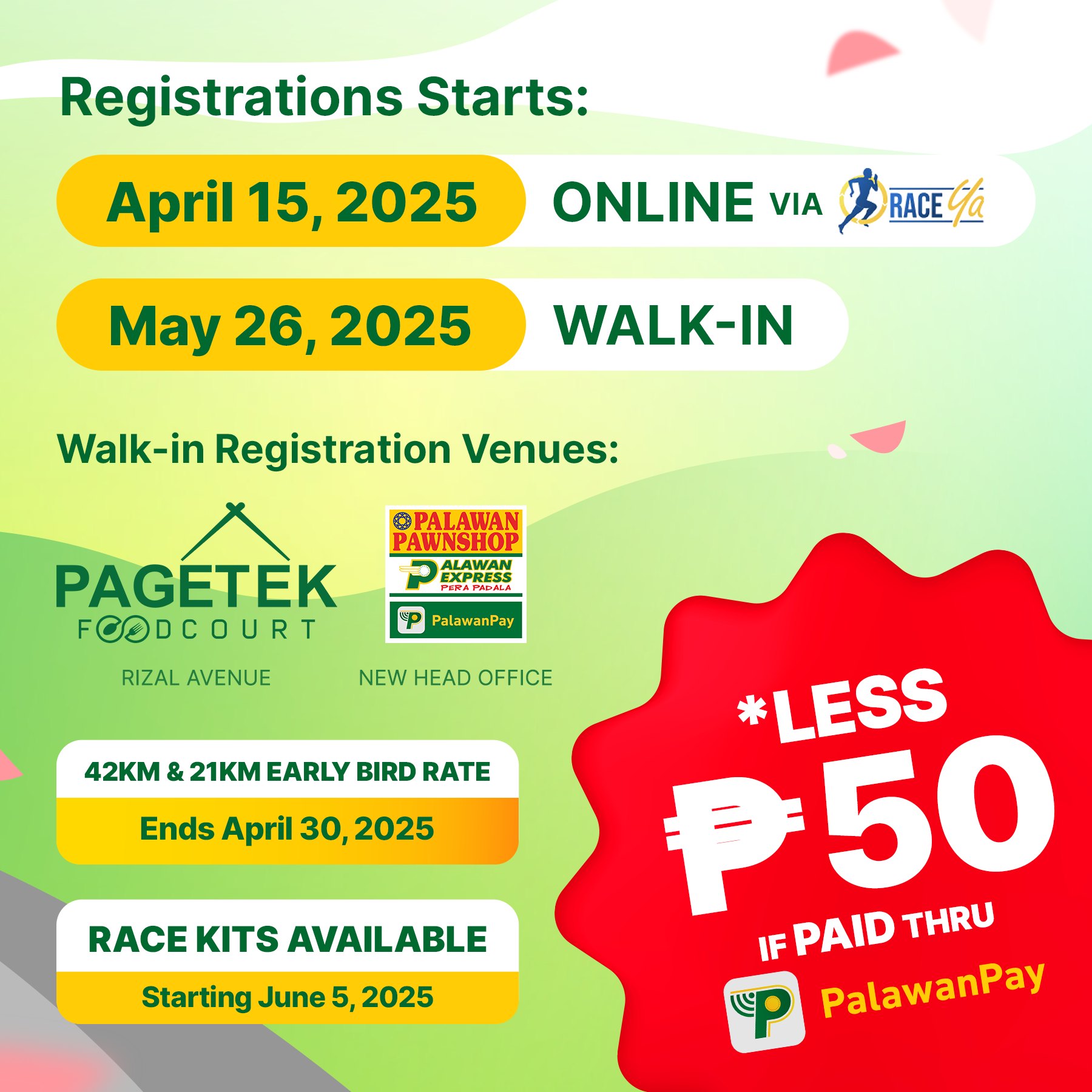 * Early bird discount: P250 off for 42K, P200 off for 21K. All categories get P50 off when paid via PalawanPay. Only one discount can be applied per transaction.