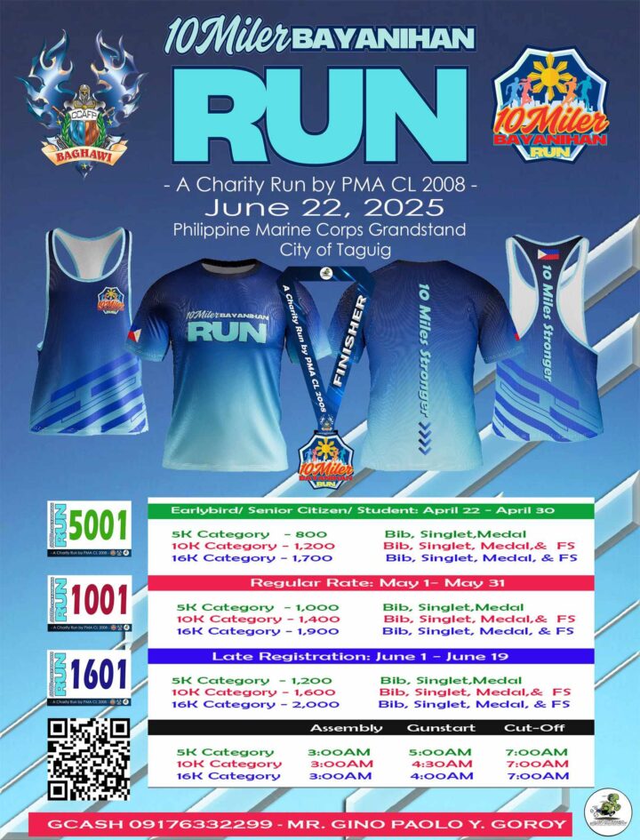 The Philippine Military Academy “BAGHAWI” Class of 2008, in partnership with Slowfootrunner Events Management, proudly presents the 10 Miler Bayanihan Run 2025, happening on June 22, 2025 at the Philippine Marine Corps Grandstand, Taguig City. This meaningful charity run invites the community to embrace the spirit of bayanihan—unity and collective effort—through fitness and social responsibility.