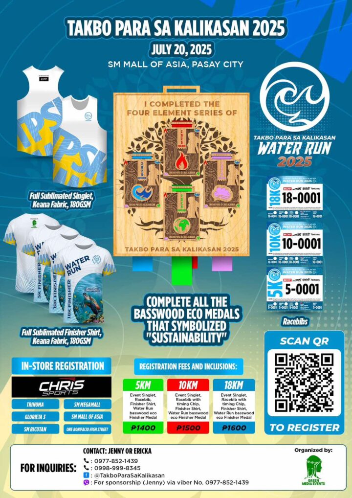 Takbo Para Sa Kalikasan: Water Run returns with 5K, 10K, and 18K categories and eco-friendly medals for all finishers.