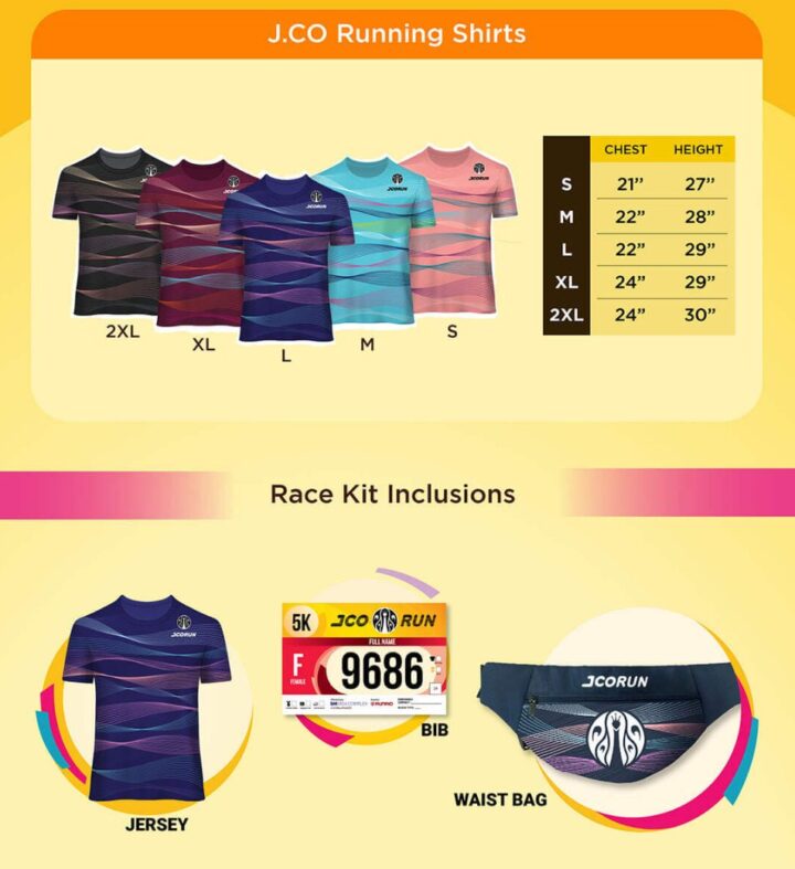 | 5K | Solo | J.CO Running Shirt, Waist Bag, Race Bib, Finisher Medal, Beverage, Half Dozen Donuts | P 1,050 |