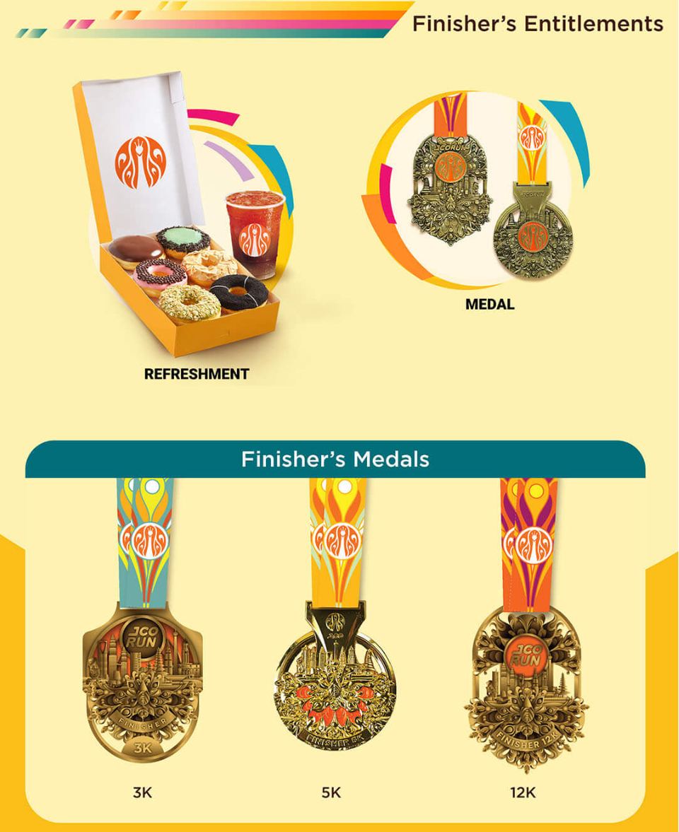 | 3K | Group (of 4) | 4 J.CO Running Shirts, 4 Waist Bags, 4 Race Bibs, 4 Finisher Medals, 4 Beverages, 1 Dozen Donuts | P 3,300 |
