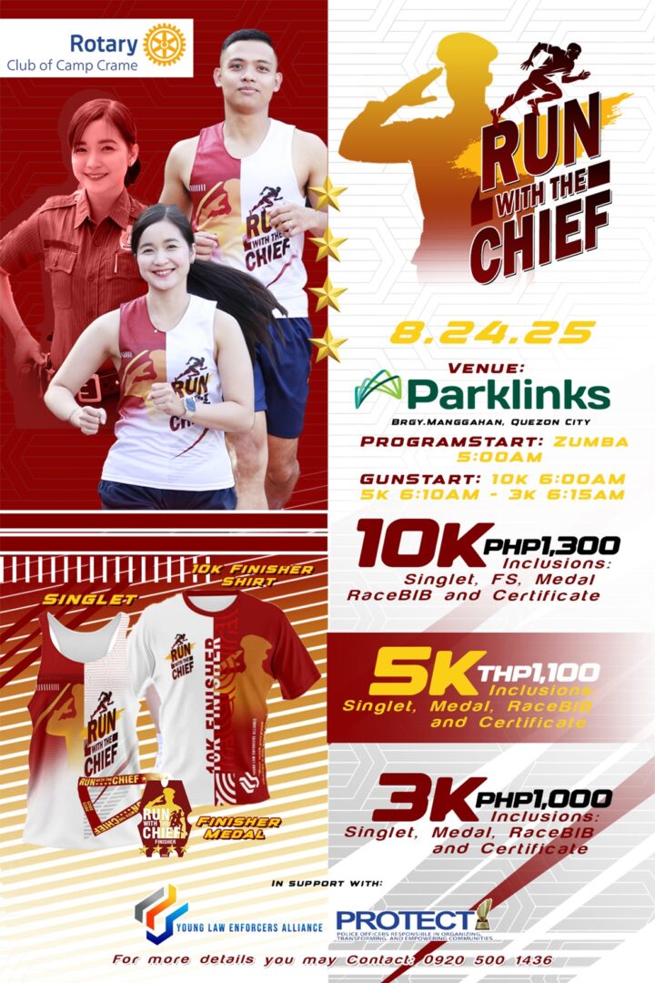 The Rotary Club of Camp Crame proudly presents Run with the Chief—a community-driven fun run happening on August 24, 2025, at Parklinks Estate in Pasig City. This special Run for a Cause invites individuals, families, and fitness enthusiasts to come together in the spirit of wellness, unity, and civic service. Participants can choose from 3K, 5K, and 10K distances, with exciting race inclusions and a vibrant Zumba session to kick off the day. Whether you’re there to run, dance, or support a good cause, Run with the Chief promises a meaningful and high-energy event for all.