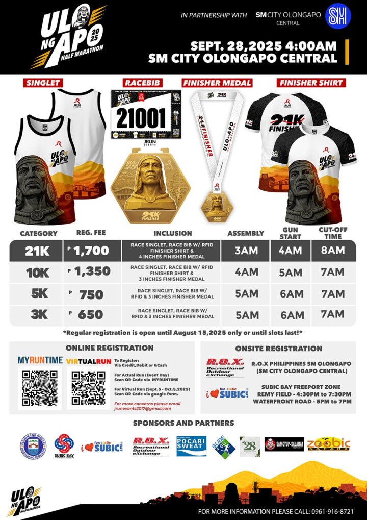 The Ulo ng Apo Half Marathon 2025 is set to take place on September 28, 2025, at SM City Olongapo Central, marking its 5th year as one of the most anticipated running events in the region. Organized by Jrun Events Management, the event brings together runners from all walks of life to celebrate health, fitness, and the cultural pride of Olongapo City and the Subic Bay Freeport Zone.