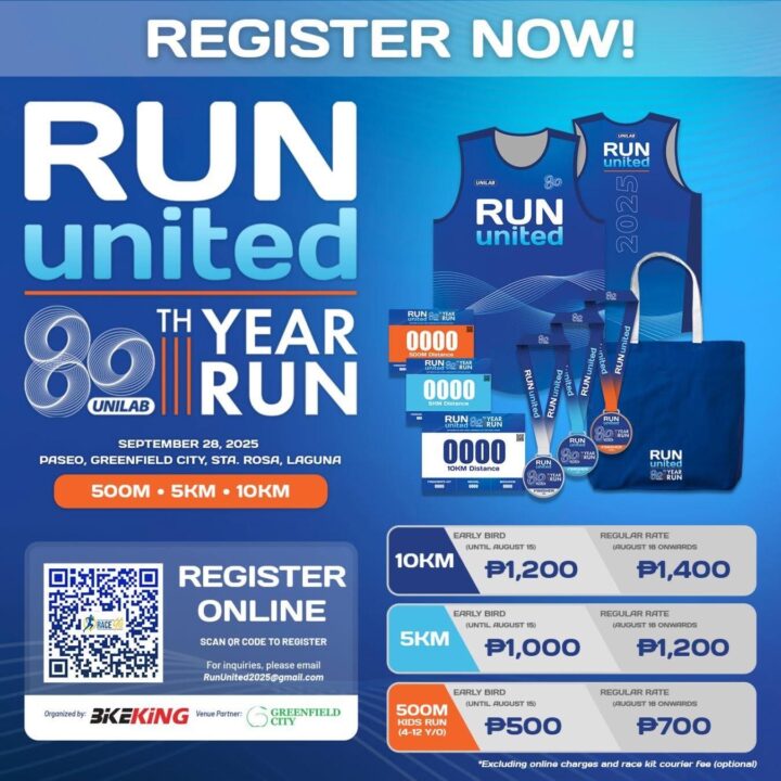 In celebration of Unilab’s 80th anniversary, runners of all ages are invited to take part in the Run United 80th Year Run happening on September 28, 2025, at Paseo, Greenfield City, Sta. Rosa, Laguna. Organized by Bike King, this milestone event offers exciting race categories — 10K, 5K, and a 500-meter dash — perfect for competitive runners, fitness enthusiasts, and families alike.