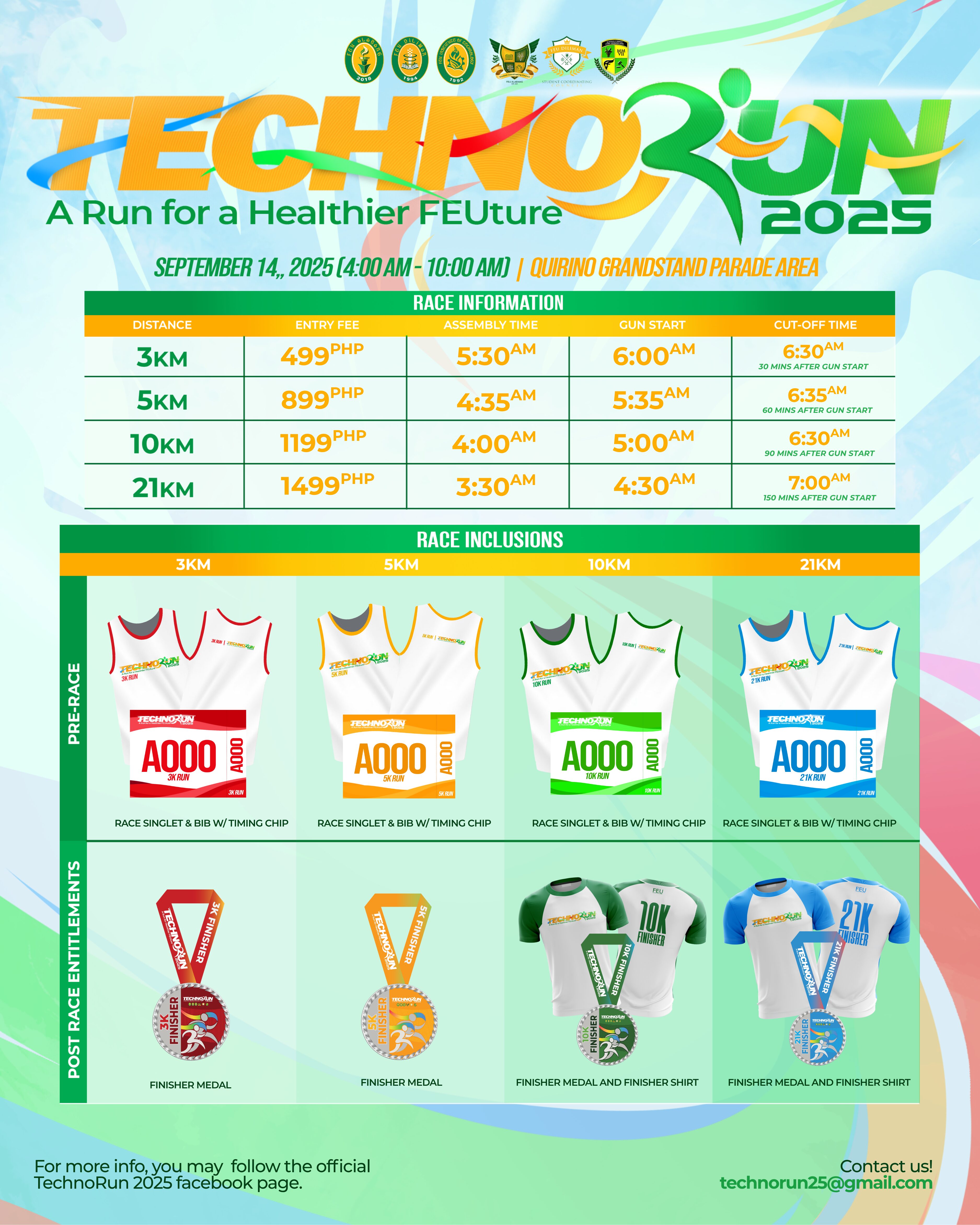 TechnoRun 2025 is set to unite runners, students, and alumni in a meaningful run for advocacy and wellness. Organized by FEU Alabang, FEU Diliman, and FEU Institute of Technology, this event highlights the importance of health, sustainability, and community service. Happening on September 14, 2025, at the Quirino Grandstand, TechnoRun 2025 offers categories from 3K to 21K, giving participants of all levels the chance to run for a healthier future.