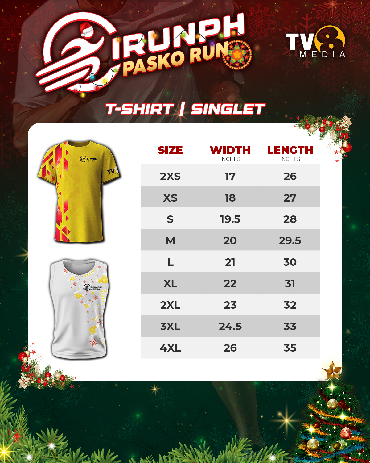| 10K | P1,599 | Full Subli Singlet, Finisher Medal, Finisher Shirt, Race Bib with RFID, Raffle Ticket, Christmas basket, and Loot bag |