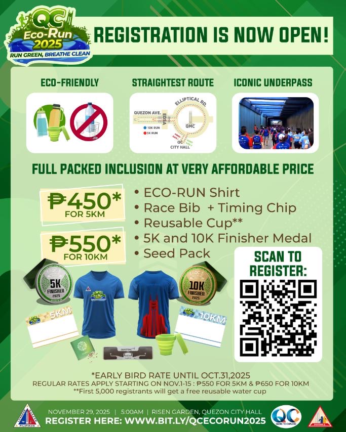 The QC Eco Run 2025, organized by Wow FitFil Movement Inc., returns on November 29, 2025, at the Quezon City Hall Risen Garden. Known for its fast and scenic course, this event gives runners a rare chance to sprint through the EDSA–Quezon Avenue Underpass, an experience normally reserved for vehicles. With its remarkably straight route, the QC Eco Run is perfect for those chasing new personal records.