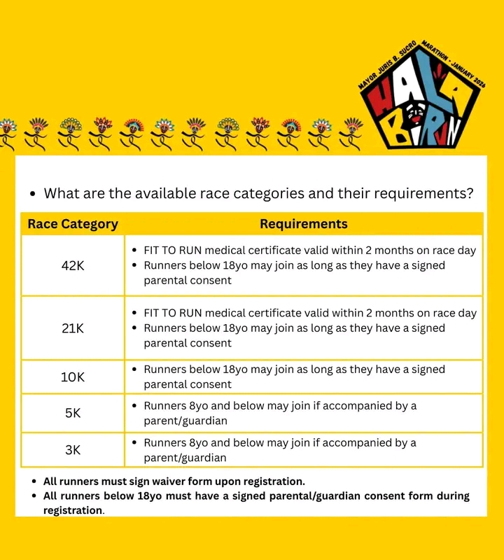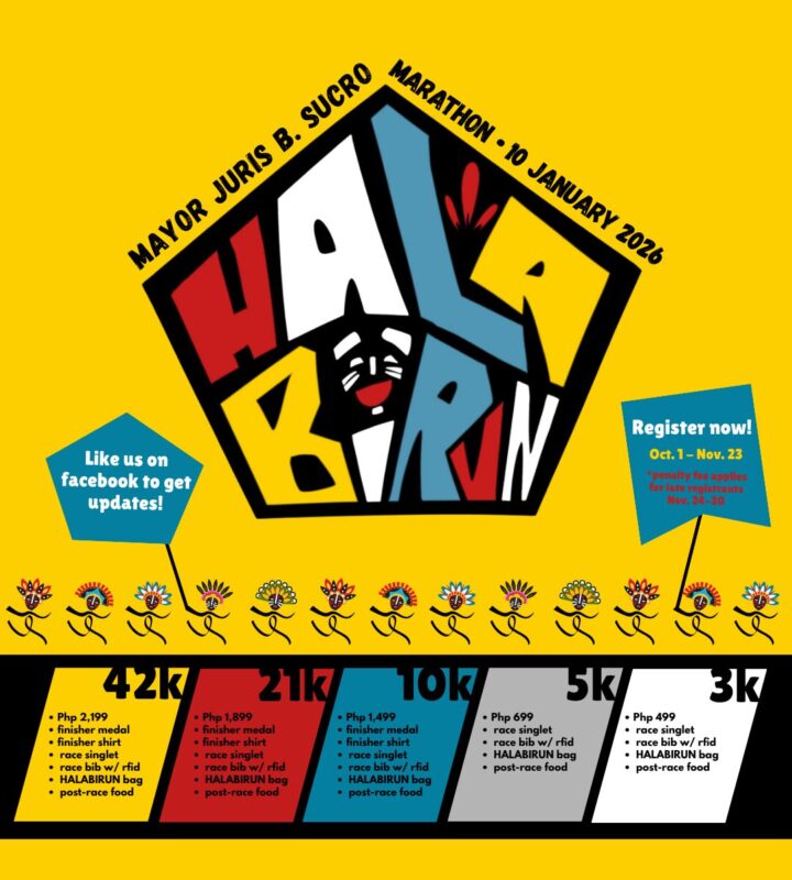 HalaBiRun 2: The Mayor Juris B. Sucro Marathon returns to the vibrant streets of Kalibo, Aklan on January 10, 2026. Organized by Halabirun Events Organizing Services, this electrifying race captures the heart-pounding rhythm and festive spirit of the Ati-Atihan season. Runners of all levels are invited to lace up and immerse themselves in the cultural celebration as they take on distances of 42K, 21K, 10K, 5K, or 3K.