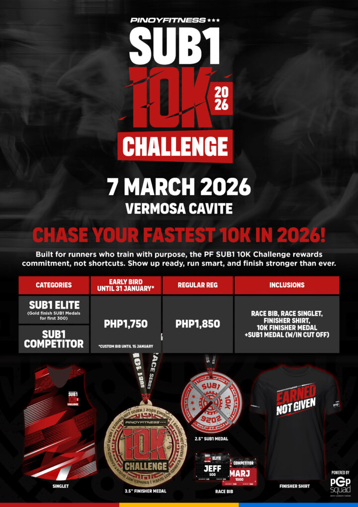 The SUB1 10K is a special milestone in running — completing 10 kilometers in under one hour. It’s an achievement that celebrates speed, discipline, and the dedication to keep improving. Unique to the Philippines, the Pinoy Fitness SUB1 10K Challenge is the race built especially for runners who dare to test their limits.