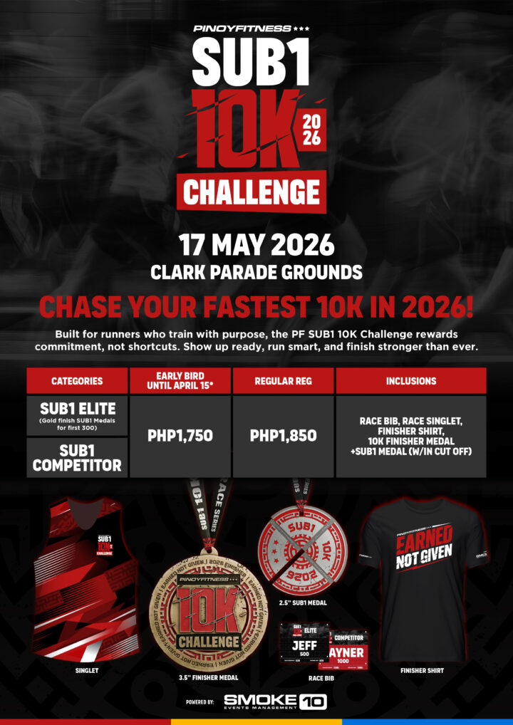 Experience one of the most exciting running challenges in the country under the fresh morning skies! The Pinoy Fitness SUB1 10K Challenge — Clark Edition powered by Smoke 10 Events Management takes place on May 17, 2026 (Sunday Morning) at Clark Parade Grounds, Pampanga, inviting runners to outrun the clock and conquer a 10K in under one hour — fueled by cool air and early-day energy.