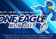One Eagle Run is a benefit run that aims to bring together the community, have fun through running and at the same time, give back to the community. 100% of the proceeds of this event will go to Blue Plate Program of Ateneo Center for Educational Development and Marawi victims through Synergeia.