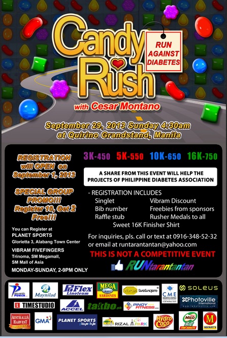 Runtarantantan is inviting everyone to join and have fun with Candy Rush - Run Against Diabetes. This event is happening at Quirino Grandstand on September 29, 2013. Save the date!