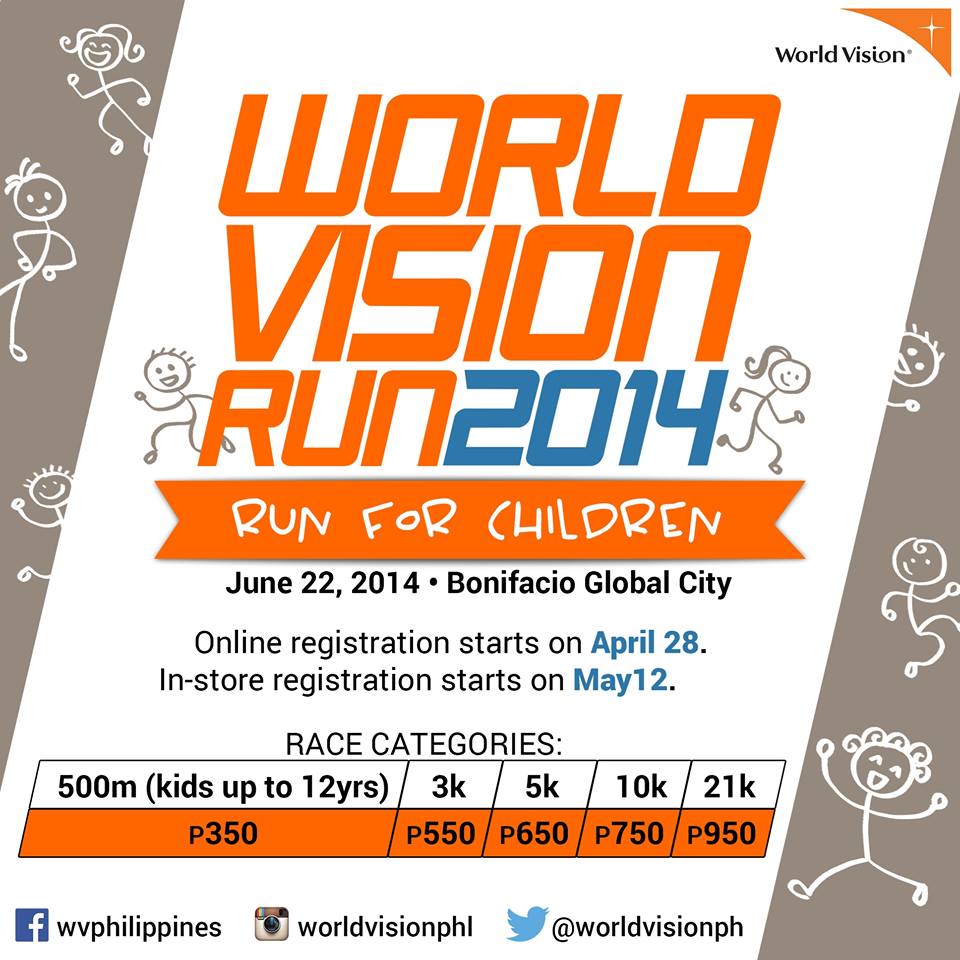 Time to once again run for the children at the World Vision Run 2014 happening on June 22, 2014 at the Bonifacio Global City! Save the Date!