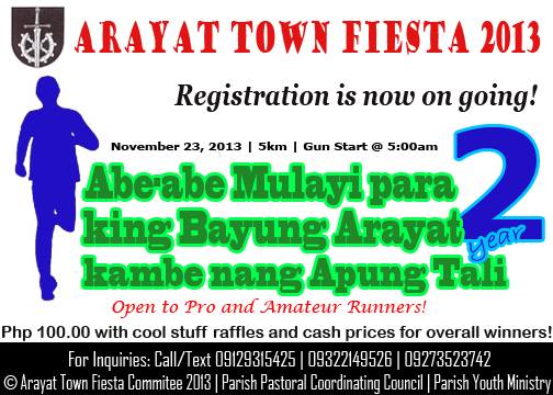 As part of the celebration of the Arayat Town Fiesta 2013, A running event called "Abe-Abe Mulayi para king Bayung Arayat kambe nang Apung Tali Year 2"