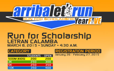 Arriba Let’s Run 2015 : Run for Scholarship Year 5 will be on March 8, 2015 in Colegio de San Juan de Letran Calamba, Calamba City Laguna.