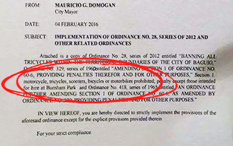 A memorandum floating around the internet indicates that Mauricio Domogan the City of Mayor of Baguio recently banned bicycles and Motorcycles in the Summer Capital of the Philippines.
