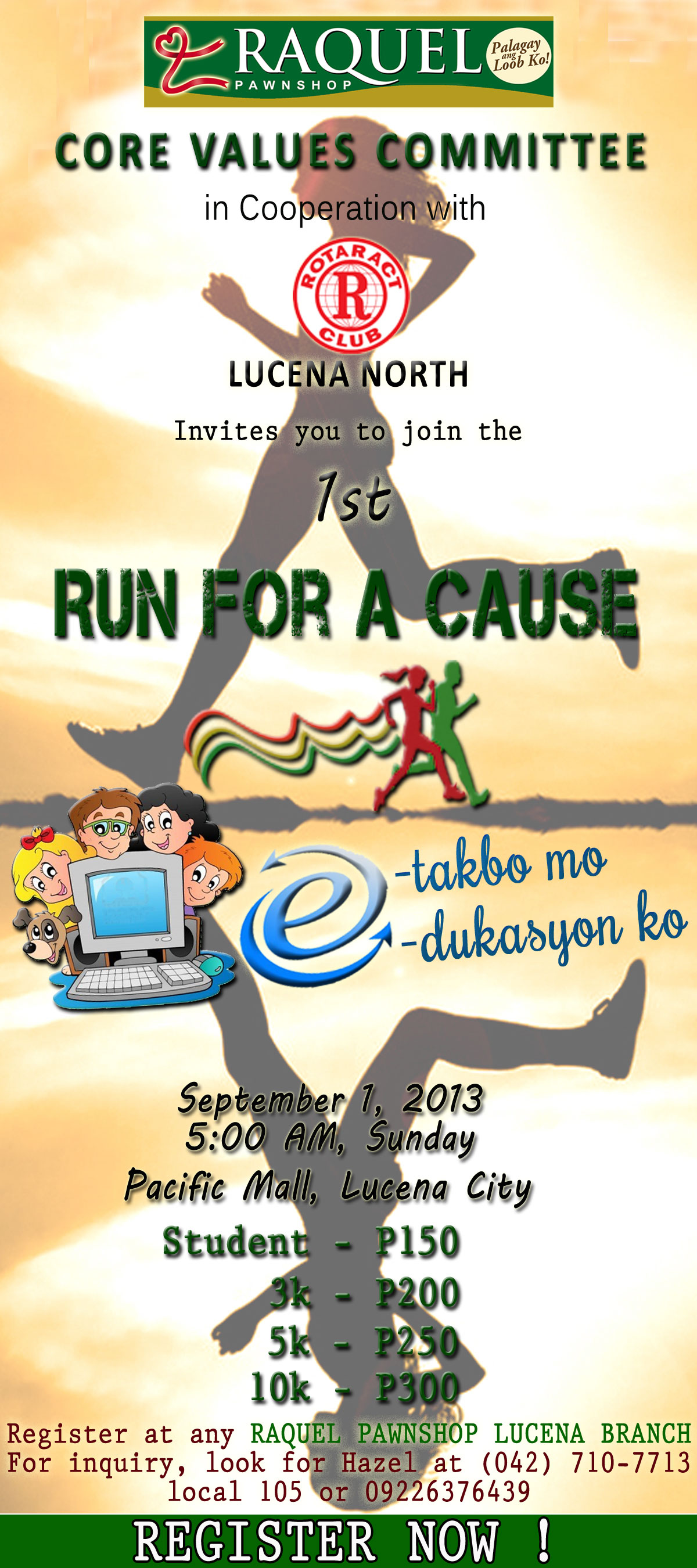 Join the 1st Run for a Cause, E-takbo Mo E-dukasyon Ko organized by Raquel Pawnshop Inc. and Core Values Committee in cooperation of Rotaract Club of Lucena North. This event is happening on September 1, 2013 at Pacific Mall, Lucena City.