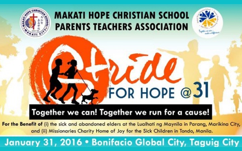 Makati Hope Christian School Parents Teacher Association brings you Stride for Hope happening on January 31, 2016 in Bonifacio Global City.