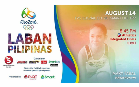 Time to show your support! Watch Mary Joy Tabal as she represents the Philippines at the Women's Marathon LIVE tonight at 8:45PM.