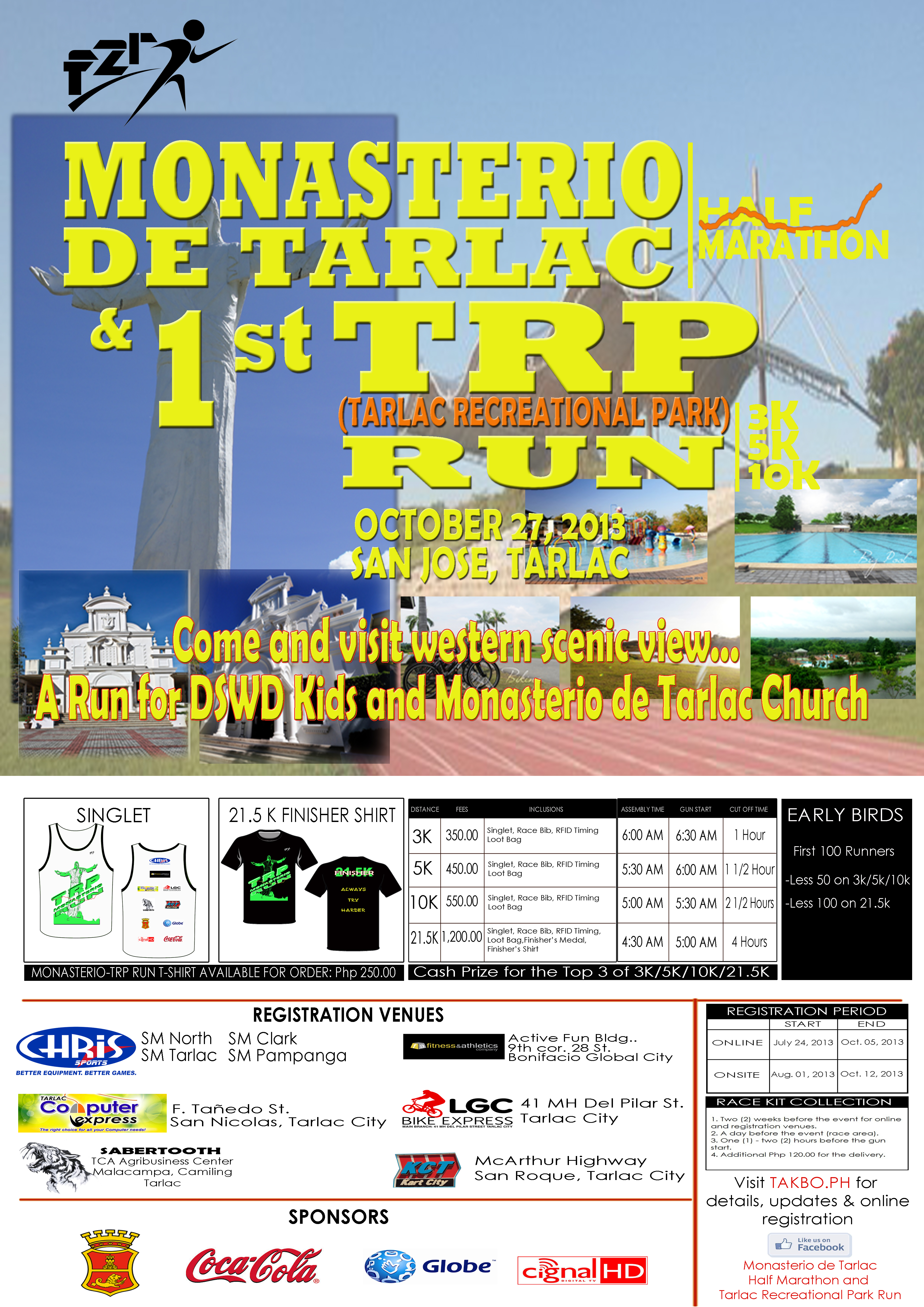 Monasterio de Tarlac Half Marathon & 1st Tarlac Recreational Park Run is happening on October 27, 2013 Tarlac Recreational Park, San Jose Tarlac. This run if for DSWD Kids, Monasterio De Tarlac Church and to promote tourism in Tarlac.
