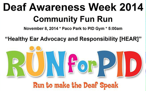 In celebration of the Deaf Awareness Week, the Philippine Institue for the Deaf will be holding a fun run on November 8, 2014 at Paco Park, Manila.