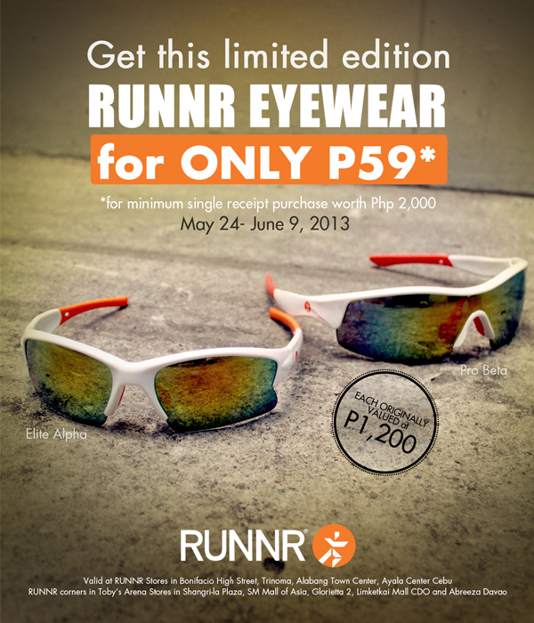 Get this limited edition RUNNR EYEWEAR for only P59 pesos for minimum single receipt purchase of P2,000 in participanting RUNNR Stores!