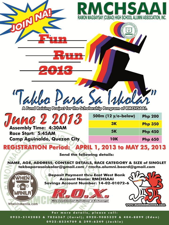 This May 19, 2013, Takbo Para Sa Iskolar will be held at Camp Aguinaldo, Quezon City. A Fund Raising Project for the Scholarship Program of RMCHSAAI.