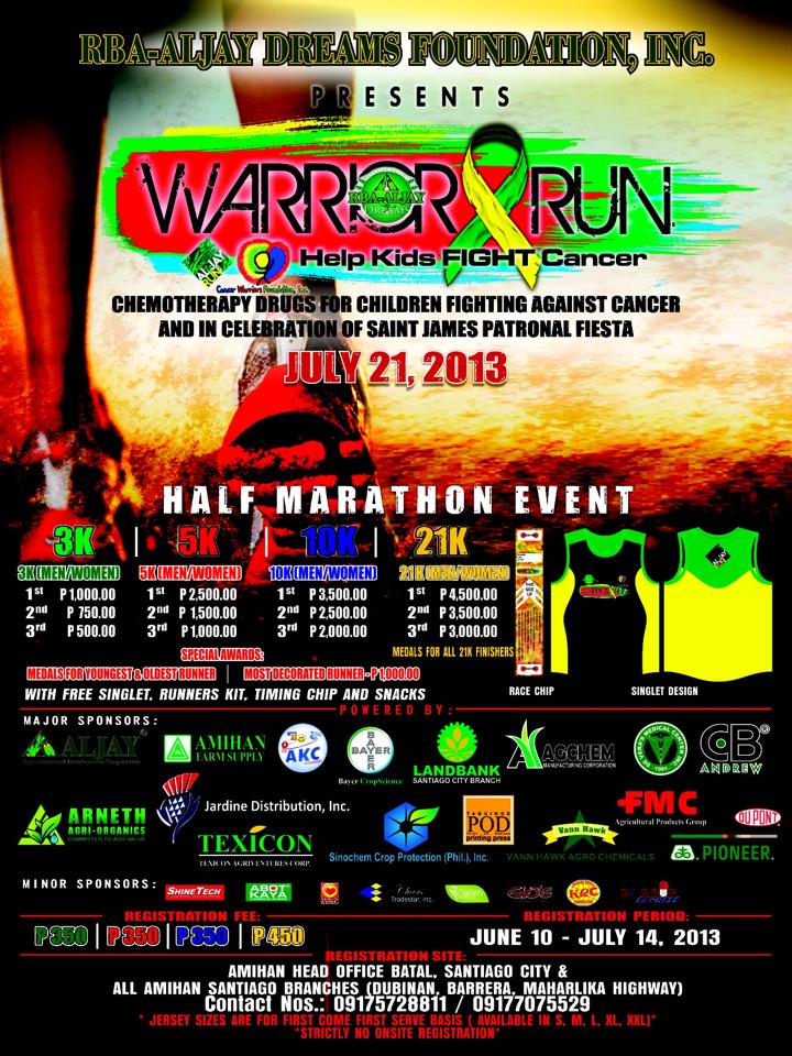 We are inviting you to support the Half-Marathon Event entitled “WARRIOR RUN: Help Kids Fight Cancer”, a fun run event scheduled on July 21, 2013. This activity aims to help make a difference in the lives of children fighting against cancer and to assist and Church donation in the celebration of Saint James Patronal Fiesta.