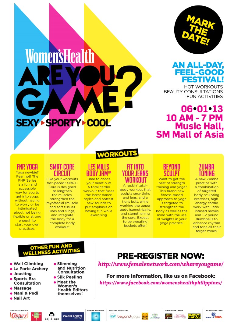 Sexy, Sporty and Cool activities are set to happen on June 1, 2013 at the Women's Health ARE YOU GAME Event! Save the date and Grab a copy of Women's Health Magazine now!